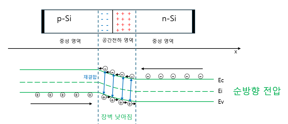 n형 영역으로부터 전자와 p형 영역으로부터 정공이 공간전하 영역을 통과하는데 그 과정에서 전자와 정공이 재결합하여 확산 전류 형성에 기여한다.